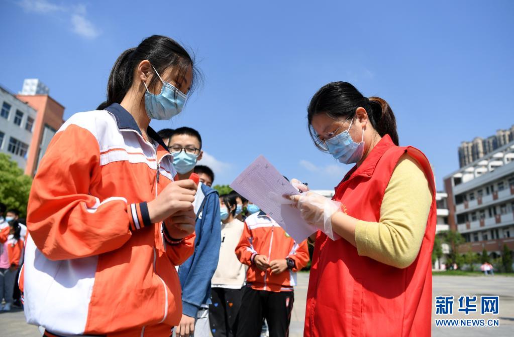 5月17日,在合肥大地学校,储开侠(前左二)协助核酸检测人员为学生进行核酸采样。“90后”储开侠是肥西县上派镇派河社区的一名工作人员,疫情出现后,储开侠顾不上照顾孩子,连续奋战在防疫一线,宣传防疫政策,组织居民开展核酸检测。