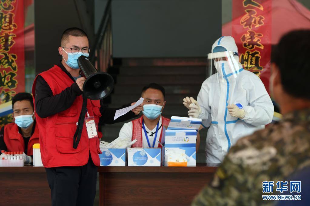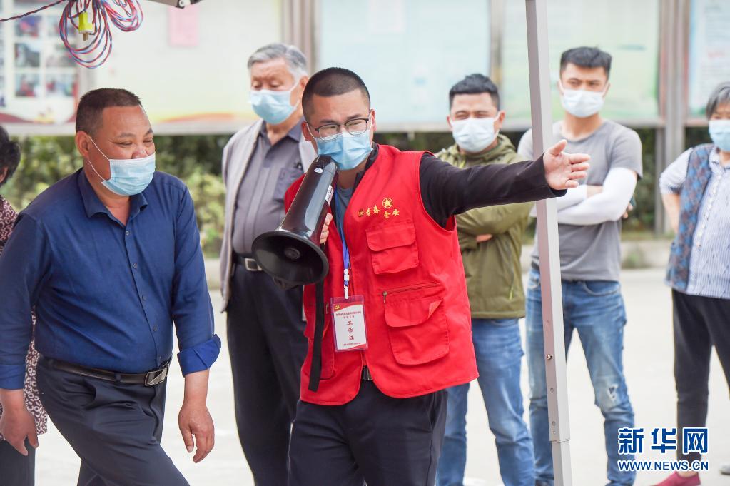 5月18日,陈刚(前左)在六安市金安区望城街道三岔河村核酸检测点维持秩序。陈刚今年24岁,疫情出现后,他主动报名成为志愿者,在疫情防控值守点值班,在核酸检测现场维持秩序。每天早上7点上岗,忙碌的时候要深夜才能下班。他说:“我原来是建档立卡贫困户,2018年脱贫。脱贫过程中,街道、村里的工作人员和其他乡亲们给了我很大的帮助,我希望能用做志愿者的方式来回馈他们。”