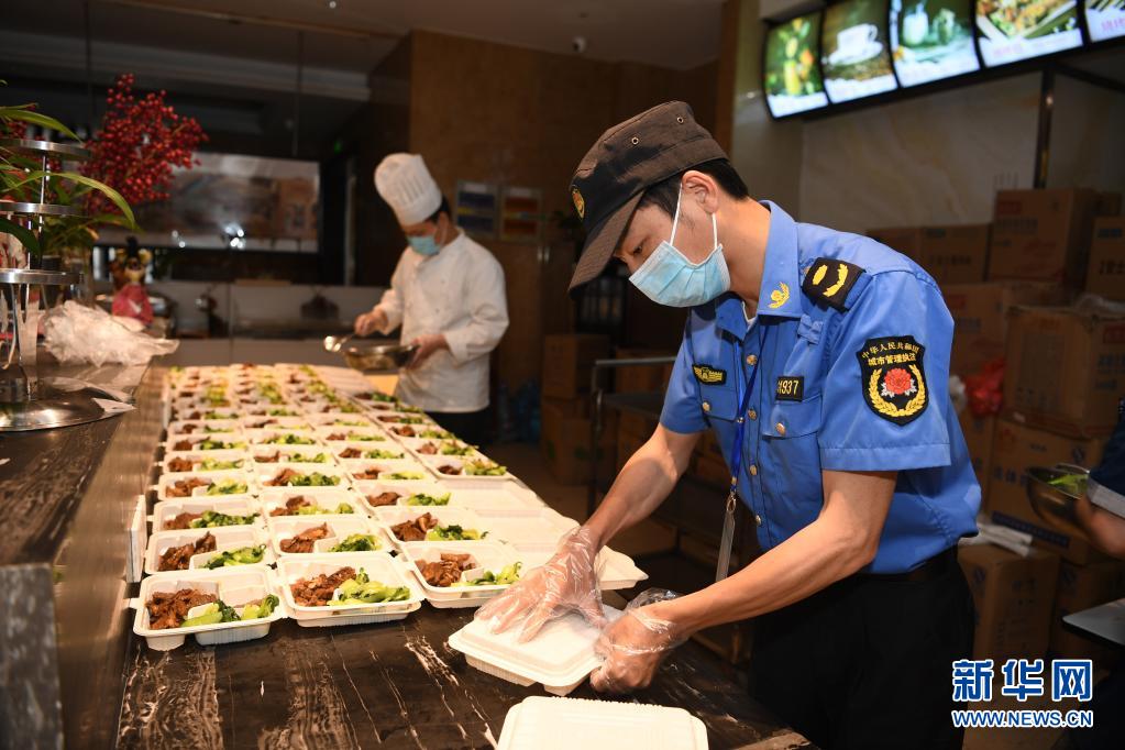 5月17日,在肥西县上派镇的一个隔离点,“90后”刘亚军(右)为被隔离的居民准备午餐。刘亚军是肥西县上派镇行政执法分局的一名工作人员,疫情出现后,刘亚军主动请缨来到隔离点工作。