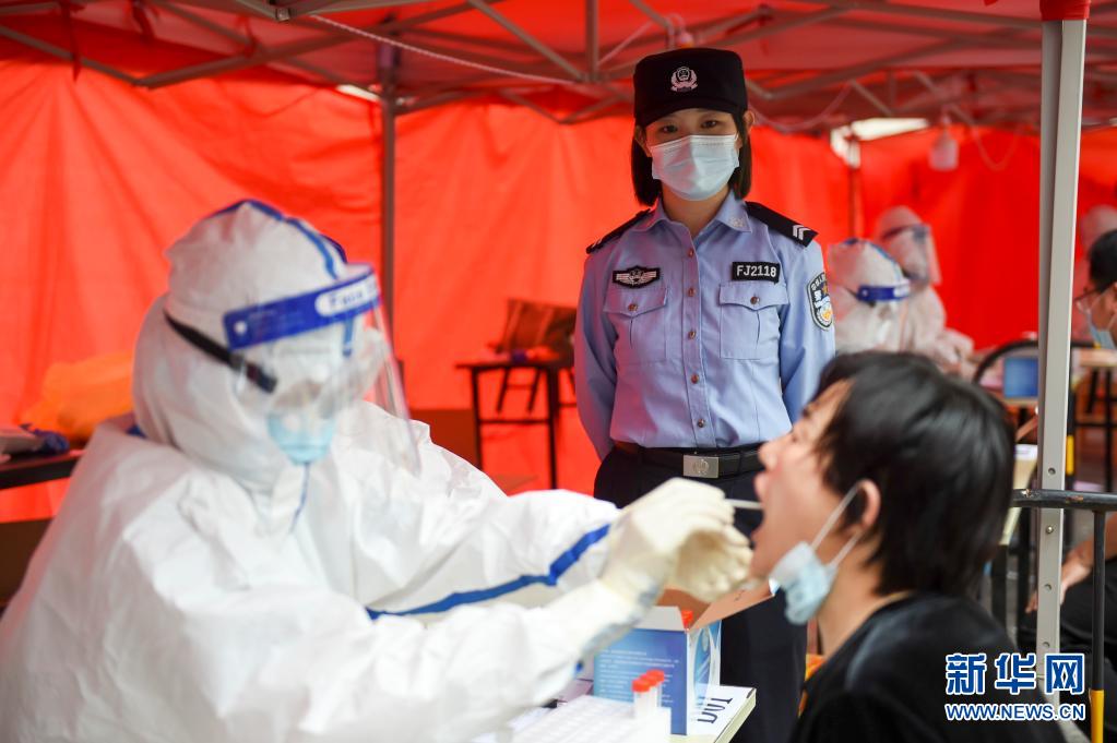 5月18日,洪娜(中)在六安市金安区浙东商贸城核酸检测点执勤。今年28岁的洪娜是六安市公安局金安分局小南海派出所的一名辅警。近期,洪娜所在辖区内的浙东商贸城被划为中风险区,她也进入了战“疫”模式,负责在值守点和核酸采集点维持现场秩序,还要和其他疫情防控人员一起在周边街区巡逻。她说:“我一直在这片社区工作,希望疫情能尽快过去。”