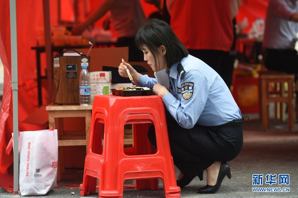 5月18日,洪娜在六安市金安区浙东商贸城疫情防控值守点匆匆吃午饭。今年28岁的洪娜是六安市公安局金安分局小南海派出所的一名辅警。近期,洪娜所在辖区内的浙东商贸城被划为中风险区,她也进入了战“疫”模式,负责在值守点和核酸采集点维持现场秩序,还要和其他疫情防控人员一起在周边街区巡逻。她说:“我一直在这片社区工作,希望疫情能尽快过去。”