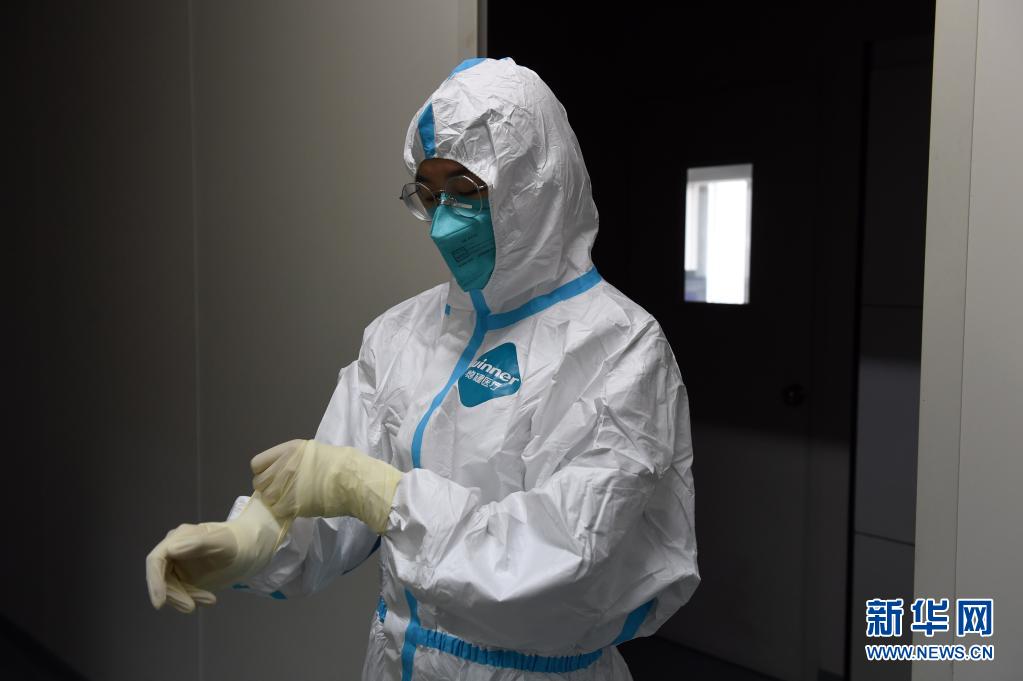 5月20日,罗新兰在感染病区工作。今年31岁的罗新兰是合肥市第一人民医院滨湖院区的一名护士。近日,罗新兰所在医院的感染病区收治了2名新冠肺炎确诊患者。目前,罗新兰和同事们已经在病区连续坚守一周,承担起患者的救治和护理工作。