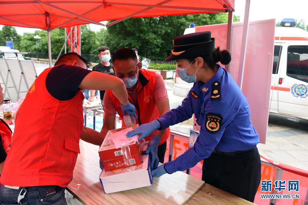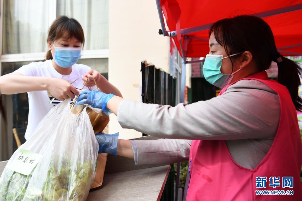 5月20日,在封闭管控的六安市清水河畔小区一期,王芳(右)将居民采购的物品运送进小区。今年41岁的王芳是安徽省六安市爱心妈妈公益协会会长。疫情发生以来,她组织了206名志愿者坚守在战“疫”一线,开展疫情防控宣传,做好防控点值班值守,帮助小区居民采购生活用品。