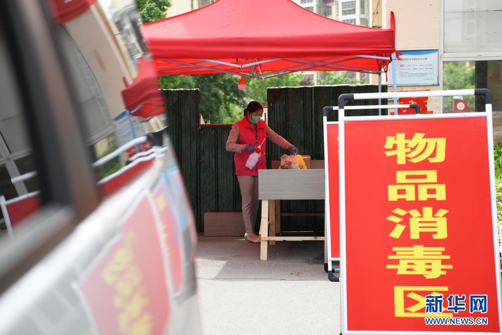 5月20日,在封闭管控的六安市清水河畔小区一期,王芳在对居民采购的物品进行消毒。今年41岁的王芳是安徽省六安市爱心妈妈公益协会会长。疫情发生以来,她组织了206名志愿者坚守在战“疫”一线,开展疫情防控宣传,做好防控点值班值守,帮助小区居民采购生活用品。