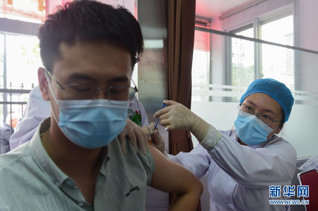 5月20日,在合肥市瑶海区铜陵路街道卫生服务中心,刘良君(右)为市民接种新冠肺炎疫苗。刘良君和丈夫孙祥宝都是合肥市瑶海区铜陵路街道卫生服务中心的医务人员,合肥市此轮新冠肺炎疫情发生以来,市民接种新冠肺炎疫苗的热情空前高涨,铜陵路街道卫生服务中心每天都满负荷运行,作为护理部主任的刘良君忙碌在疫苗接种、预检、咨询等多个岗位,虽然与丈夫近在咫尺,却鲜有时间交流。