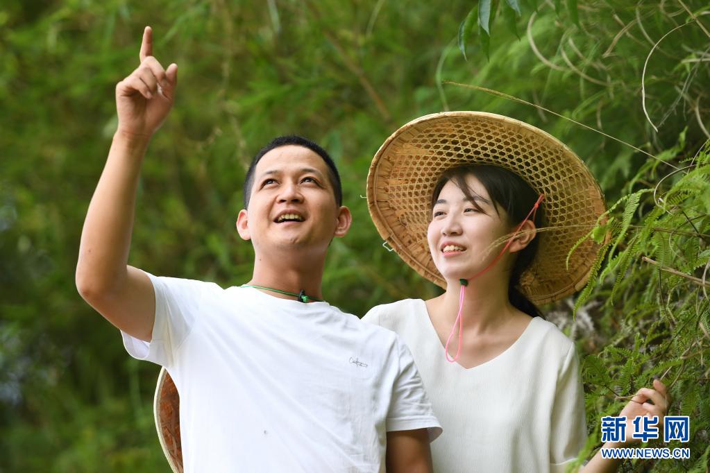 5月19日,柯嘉华(右)和周晰在南塘村塔尾自然村的山上寻找新鲜粽叶准备用来包装农产品。