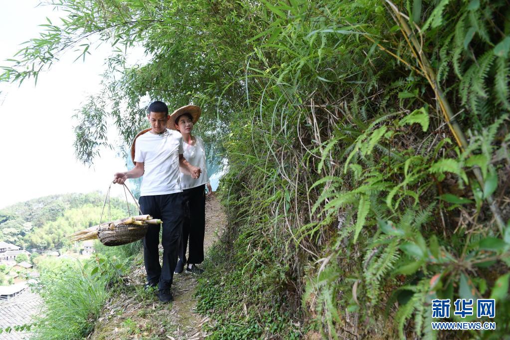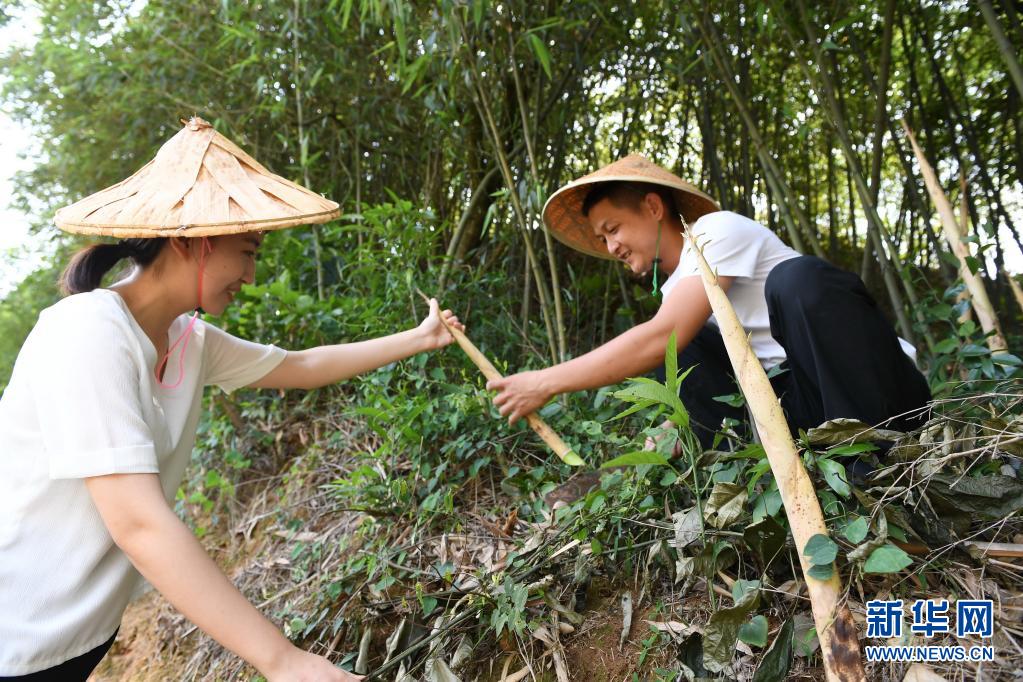 5月19日,柯嘉华(右)在竹林里将刚砍下的石笋递给周晰。