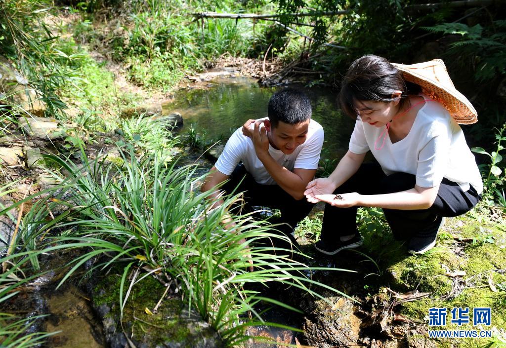 5月19日,柯嘉华(左)在南塘村塔尾自然村的一条小溪旁给周晰讲小时候摸田螺的故事。