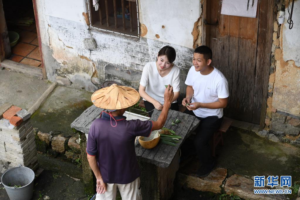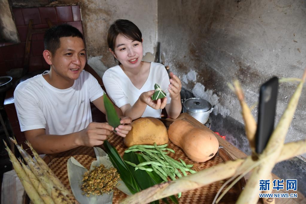 5月19日,柯嘉华(右)和周晰在用粽叶包装金银花。