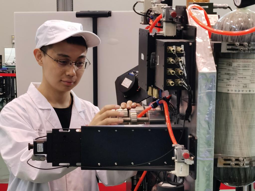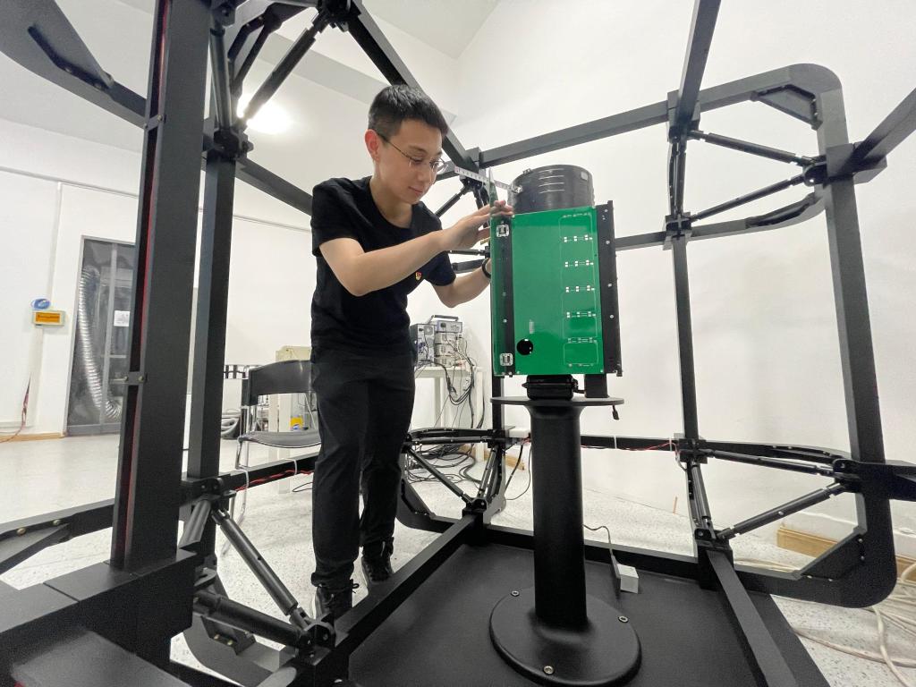 奚瑞辰在磁环境模拟器中调试卫星。(新华社记者杨思琪摄)