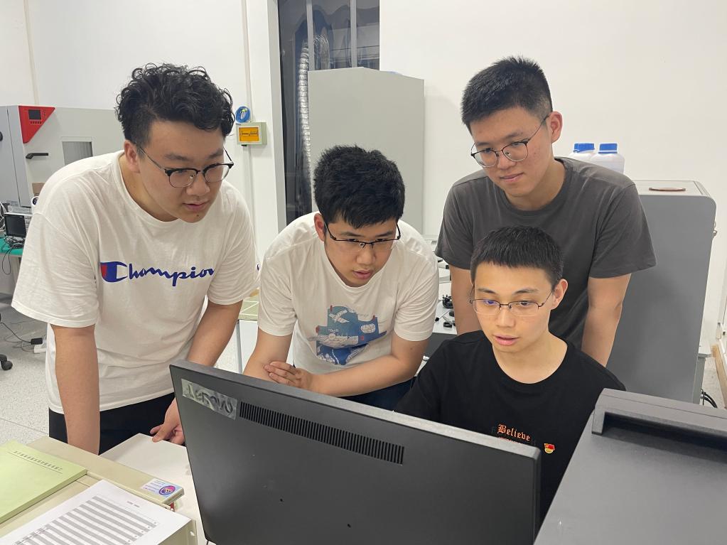 奚瑞辰(右一)为学弟讲述卫星试验程序。(新华社记者杨思琪摄)