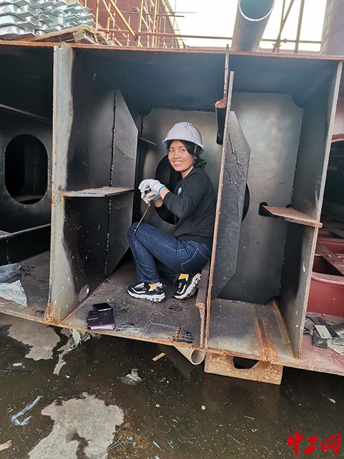 夏日的高温对验船师来说更是严峻的考验,暴露在太阳底下的钢质船体,舱内温度高达四五十摄氏度。为了不耽误生产,黄燕玲一头扎进舱里,一检验就是2个多小时。