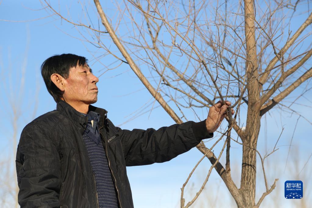 董福财在北甸子村查看树木过冬情况(2014年12月11日摄)。新华社发