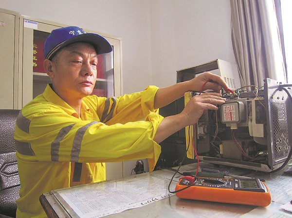 “老黎,你退休是车间一大损失啊!”车间副主任高国锋感叹。每年暑期,黎增俭会带领综合组对车间所有防暑设施进行统一检查整治,更换窗纱、检测空调、修理电扇……努力为现场检车员创造良好的度夏环境。他还带着电脱维修工张雷,顶着烈日加强对现场电动脱轨器等设施的日常巡查。记得一天中午,黎增俭突然接到现场检车员的故障反馈,现场9道和10道之间南头地面试风设施的软管与连接器滑脱。当时,现场气温近40摄氏度,考虑到黎增俭刚辛苦熬汤一个上午,高国锋说:“作业计划里一时半会儿9道和10道都不进车,你可以先歇会儿再去处理。”黎增俭却说:“谢谢领导关心,我能行!”说着就收拾起了工具包。