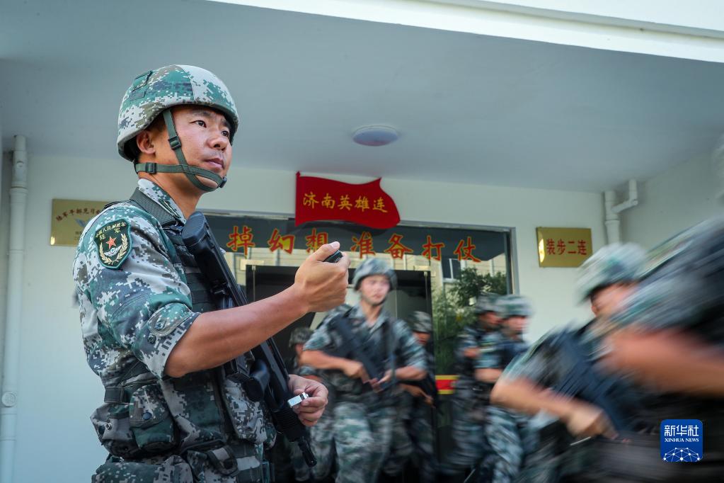 孙金龙(左)组织连队官兵进行紧急出动演练(6月24日摄)。新华社发(王磊 摄)