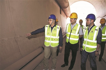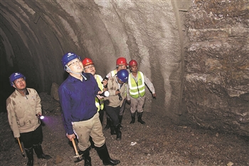 朱国金(左二)与同事深入隧洞实地踏勘工程情况。
