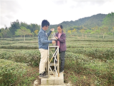 温丽华(右)指导业务人员查看仙堂山茶场观测设备 叶丽文/摄
