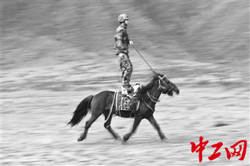 在十个马上训练科目中,25岁的阿不都沙拉木·艾尼瓦尔最害怕的是“马上瞭望”——这个动作要求骑兵在战马行进或奔跑时能平稳地直立在马背上。还算是“新兵”的阿不都沙拉木总担心自己会从马背上摔下来。