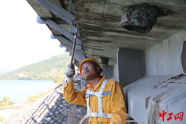 “孙栋,我们先检查步行板。”带班人张玮从工具包中拿出喷漆和红色油笔,与职工孙栋走上桥,“由步行板铺设的走道是人们过桥必经之‘路’,步行板的质量关系着人的生命安全,每块都得检查好。”张玮严肃地说道。