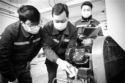 闫冬组织班组长和安保人员检查车辆维修打气泵设备 通讯员 马振涛/摄