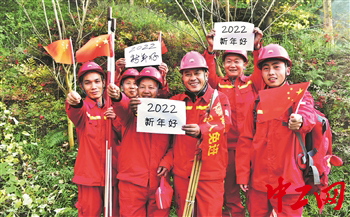 2022年元旦前夕,在川东开江—梁平海槽二维勘探项目工地上,中石油东方物探西南分公司民爆工程中心三队3X13班下药工们发出新年问候。邓建 马建渝 唐遂川 摄