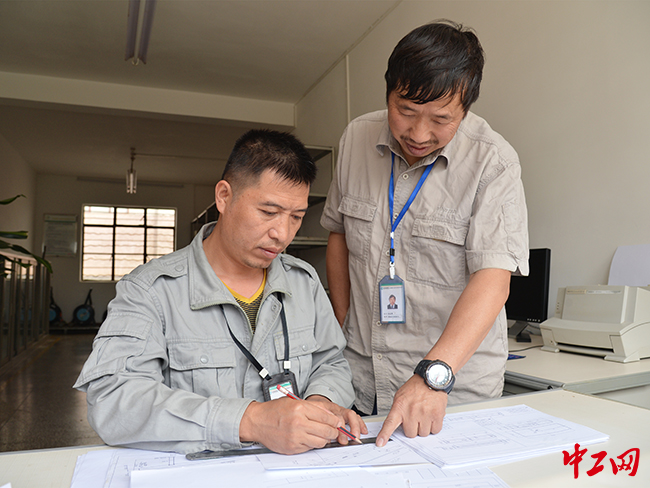 杜红明(右一)在指导同事绘制图纸 孙惟刚 摄