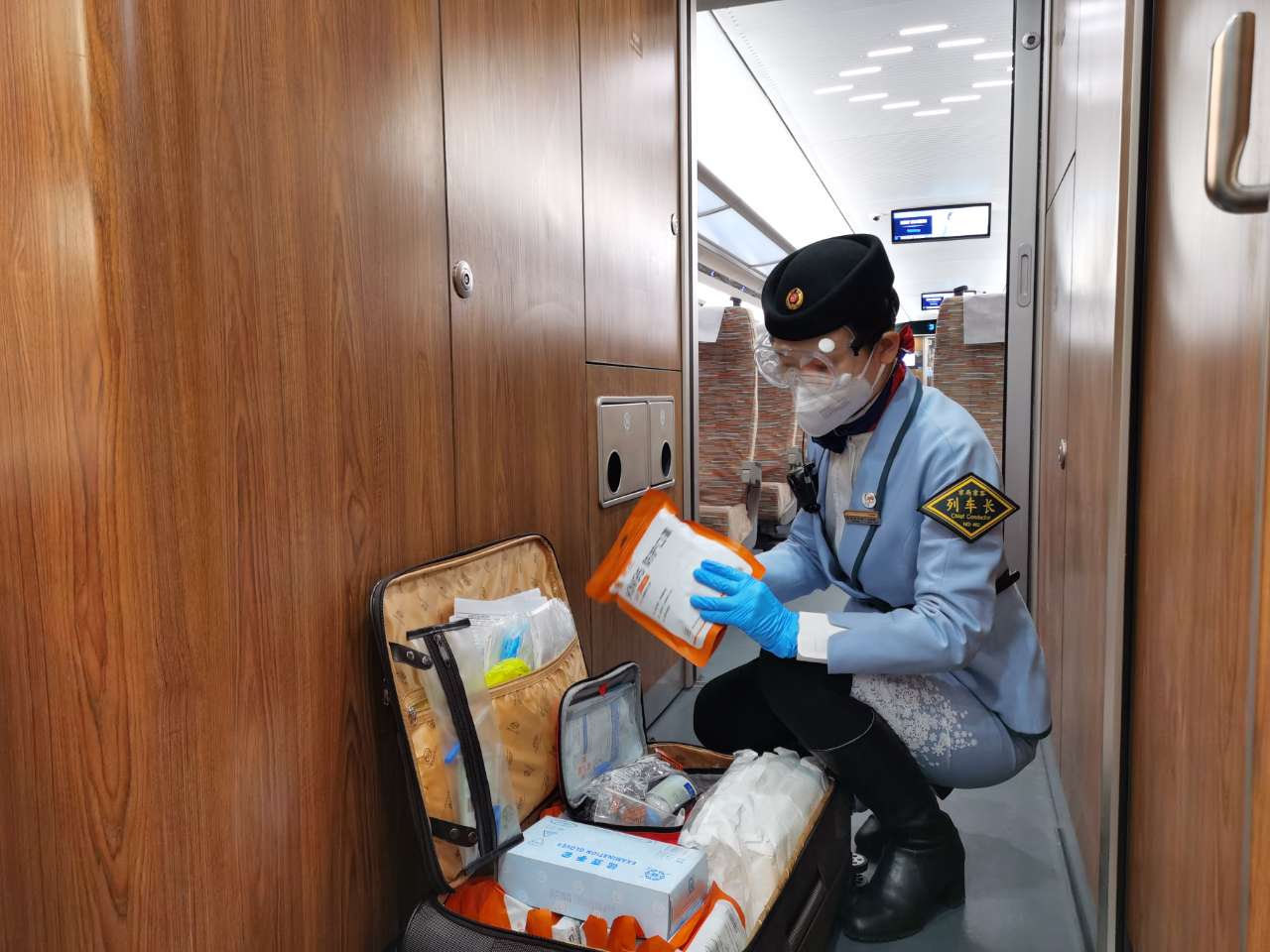 化好工作妆,盘起头发,朱丹娜给了镜子里的自己一个自信的微笑。准备好值乘所需的防疫备品,口罩、护目镜、手套……她再次逐一进行检查,确保防护到位。“G8825次全体人员下站台。”朱丹娜在电台里下了一声指令,“雪之梦”班组一天的工作开始了。她们快速定位备品,进行列车出库卫生、设备设施、防疫备品、消耗品的定位检查。开车前10分钟在车门口处立岗迎接旅客乘车……