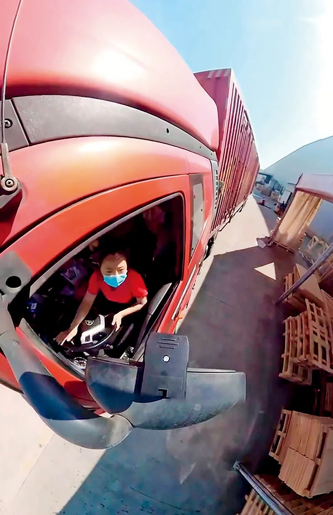 4月上旬,张莉在江苏无锡卸货,尽管车上贴着封条、无法下车看后面的障碍物,她仍然成功倒车。图/受访者提供