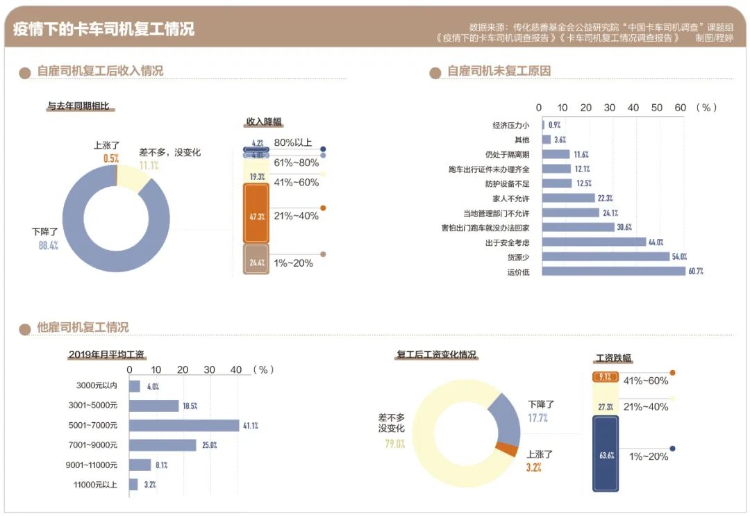 “根据1801份调查结果,35.7%的自雇卡车司机今年3月份净收入在3000元以下。”周潇说,造成收入如此低迷的原因包括运价降低、跑车趟数减少、油价上涨等。