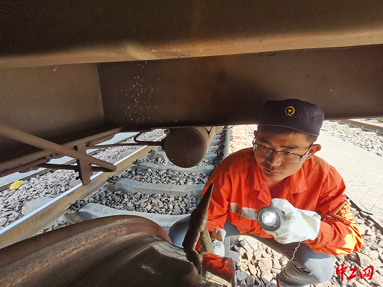 杨飞飞在检查货车轮对踏面状态。