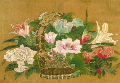 南宋院体花鸟画家秉承北宋雅致细腻的画风,受到皇室贵族的喜爱。李嵩作为南宋宫廷画家,任待诏近六十年,流传下来一件作为灯片装饰之用的《花篮图》颇有特色。此图绢本设色,大小不足一尺见方,现收藏在故宫博物院。图中共画五种花卉:萱花、石榴、蜀葵、夜合花、栀子花,画家以重彩、粉彩、渲染、分染等技法来表现。藤黄、胭脂、朱砂、石绿尽显花叶鲜美之色。那楚楚动人的娇艳,不仅让人赏色还似乎闻到了芳香。画中的篮子名曰“隆盛篮”,应是皇家庆贺节日的重要花器。画家将花器的结构、图案、颜色一一描绘,这让我想到了意大利画家卡拉瓦乔于16世纪创作的一幅《水果篮》,写真的形与色似乎与东方的《花篮图》如出一辙,只是李嵩完成此图早于卡拉瓦乔几个世纪。