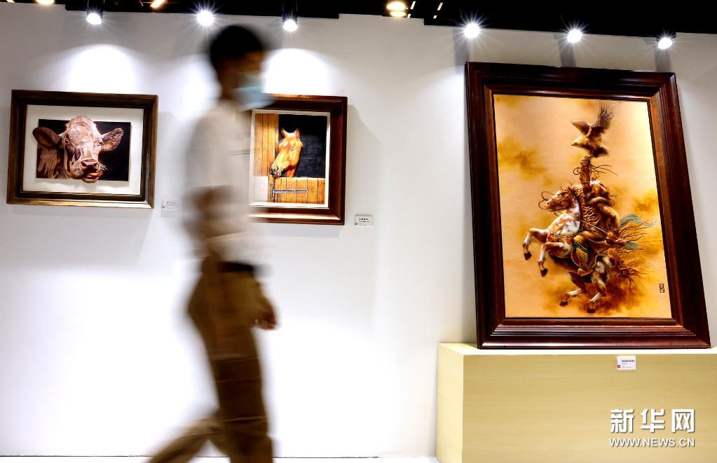 7月9日,参观者在观看展品。当日,“皮里乾坤——中国皮革文化艺术主题展”在上海汽车博物馆揭幕,现场展出170件(套)技艺精湛的皮雕、皮塑、皮革烙画以及皮革装置艺术品,吸引观众前来观赏。新华社记者 陈飞 摄