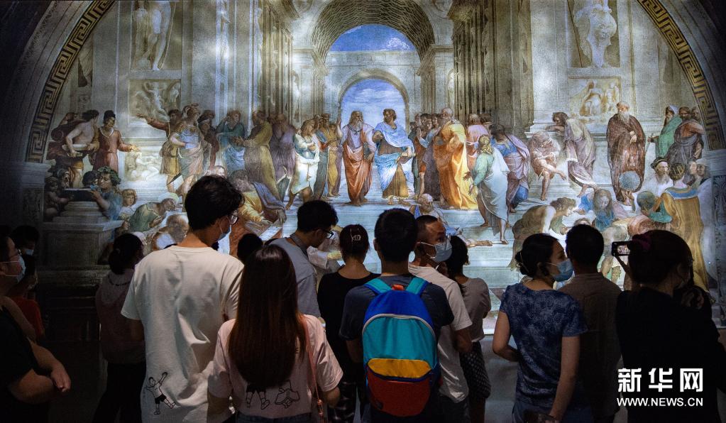 7月10日,参观者在北京嘉德艺术中心观看展品《雅典学院》。新华社记者 陈钟昊 摄
