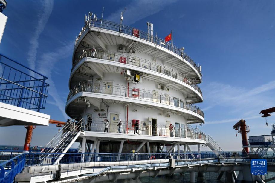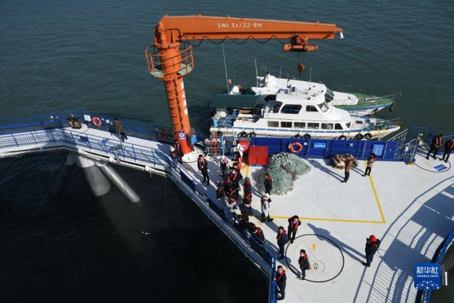 10月18日,参观者在“耕海1号”海洋牧场综合体平台上参观。“耕海1号”海洋牧场综合体平台位于山东省烟台市渔人码头以东海域,将渔业养殖、海上旅游、科技研发等功能相结合,以科技创新提升渔业养殖效率,实现海洋渔业转型升级。据介绍,“耕海1号”一期由三个养殖网箱组合而成,总养殖体积30000立方米,该平台配备自动投喂、环境监测、船舶防碰撞等系统及无人船、水下巡检机器人等技术设备,可实现生产全过程智能化控制。新华社记者 李紫恒 摄