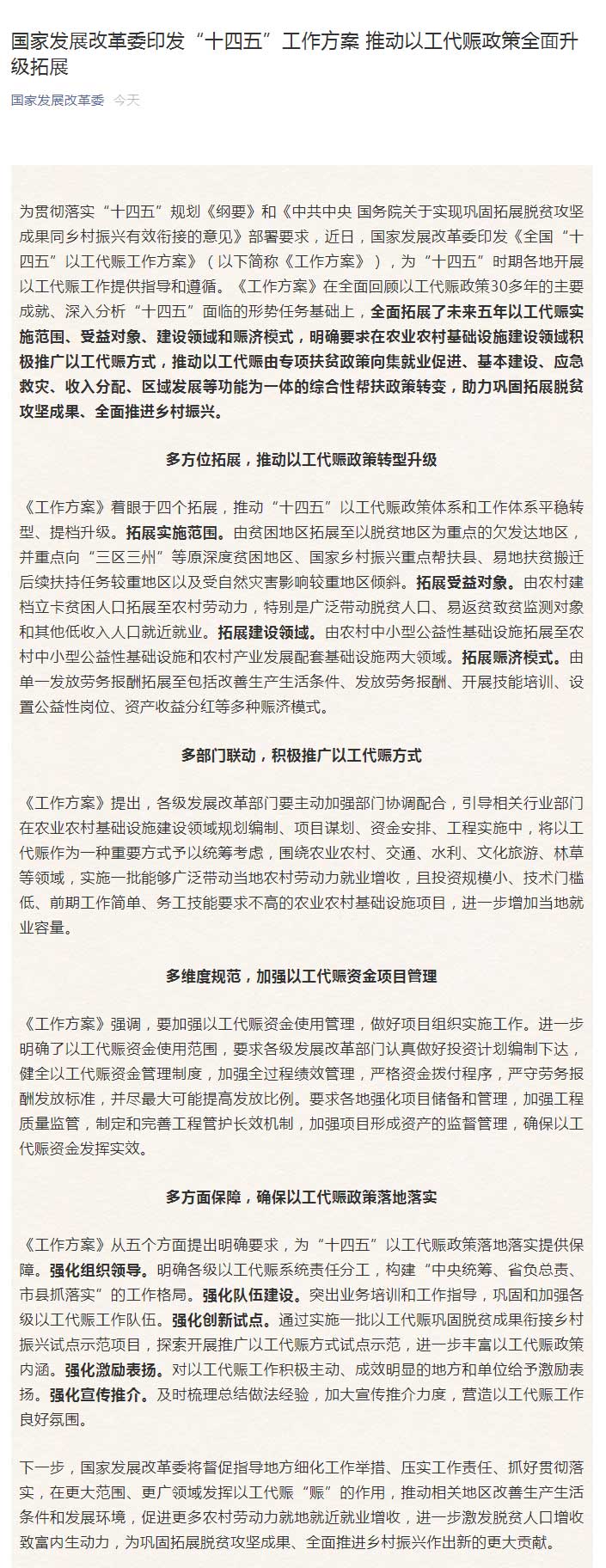 中工网消息 据国家发展改革委官方微信公众号消息,近日,国家发展改革委印发《全国“十四五”以工代赈工作方案》(以下简称《工作方案》),为“十四五”时期各地开展以工代赈工作提供指导和遵循。《工作方案》在全面回顾以工代赈政策30多年的主要成就、深入分析“十四五”面临的形势任务基础上,全面拓展了未来五年以工代赈实施范围、受益对象、建设领域和赈济模式,明确要求在农业农村基础设施建设领域积极推广以工代赈方式,推动以工代赈由专项扶贫政策向集就业促进、基本建设、应急救灾、收入分配、区域发展等功能为一体的综合性帮扶政策转变,助力巩固拓展脱贫攻坚成果、全面推进乡村振兴。