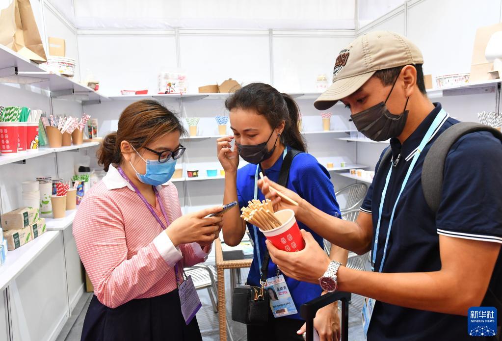 10月15日,在第130届广交会上,来自哈萨克斯坦的采购商在和一家环保餐具参展商(左)洽谈。新华社记者 刘大伟 摄