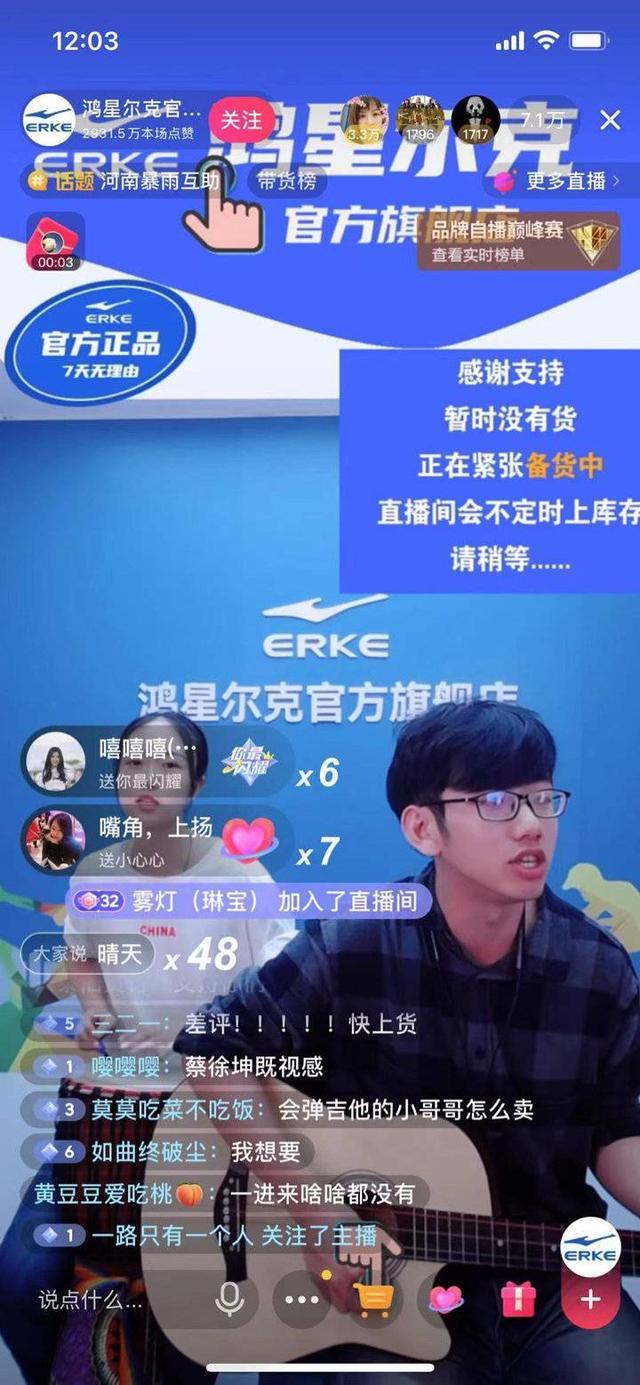 打开鸿星尔克的抖音直播间,一位帅气的小哥在弹唱着流行歌曲,不时还有网友在点着歌。24日中午12点钟,此时的直播间在线人数为7万多人,但是并没有卖货,为啥呢?