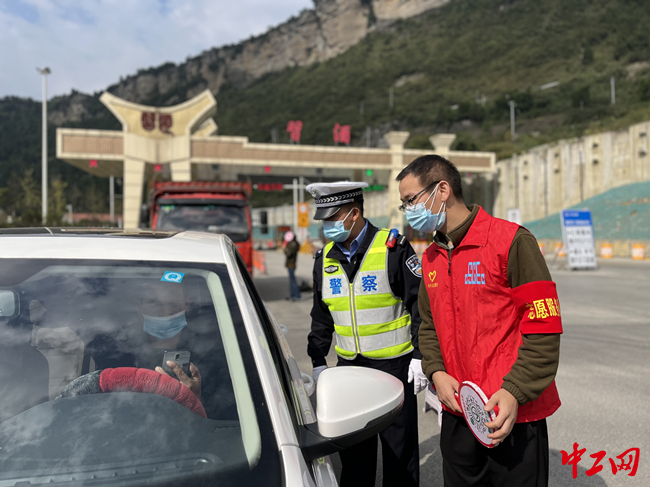 “师傅,您从哪里过来的?请出示一下您的健康码和行程码。”在贵州省遵义市习水县习酒高速收费站,余庭伸手拦下一辆出站车辆,协助一旁的交警进行疫情防控检查。