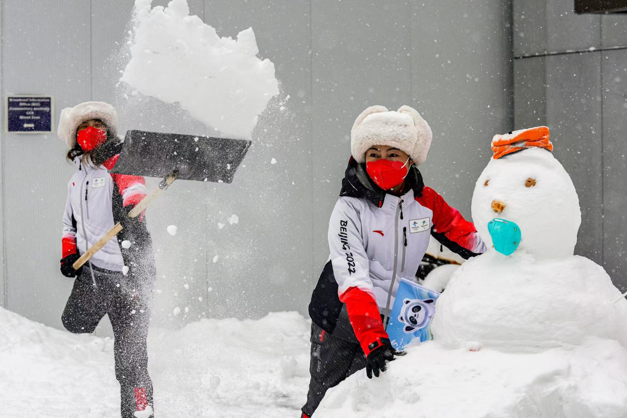 由赛区志愿者和清洁人员堆的雪人。工人日报-中工网记者王伟伟摄
