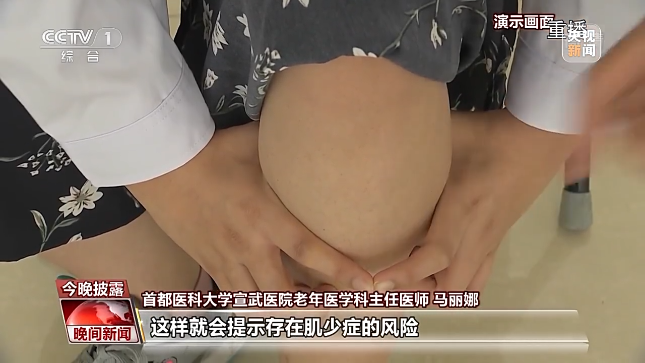 首都医科大学宣武医院老年医学科主任医师 马丽娜:有一个简单的指环实验,那么就双手,那个拇指和食指这样一个圈,放到那么小腿最粗的地方。那么如果这个圈不够,到刚刚好,到轻松的话,这样就会提示存在肌少症的风险。