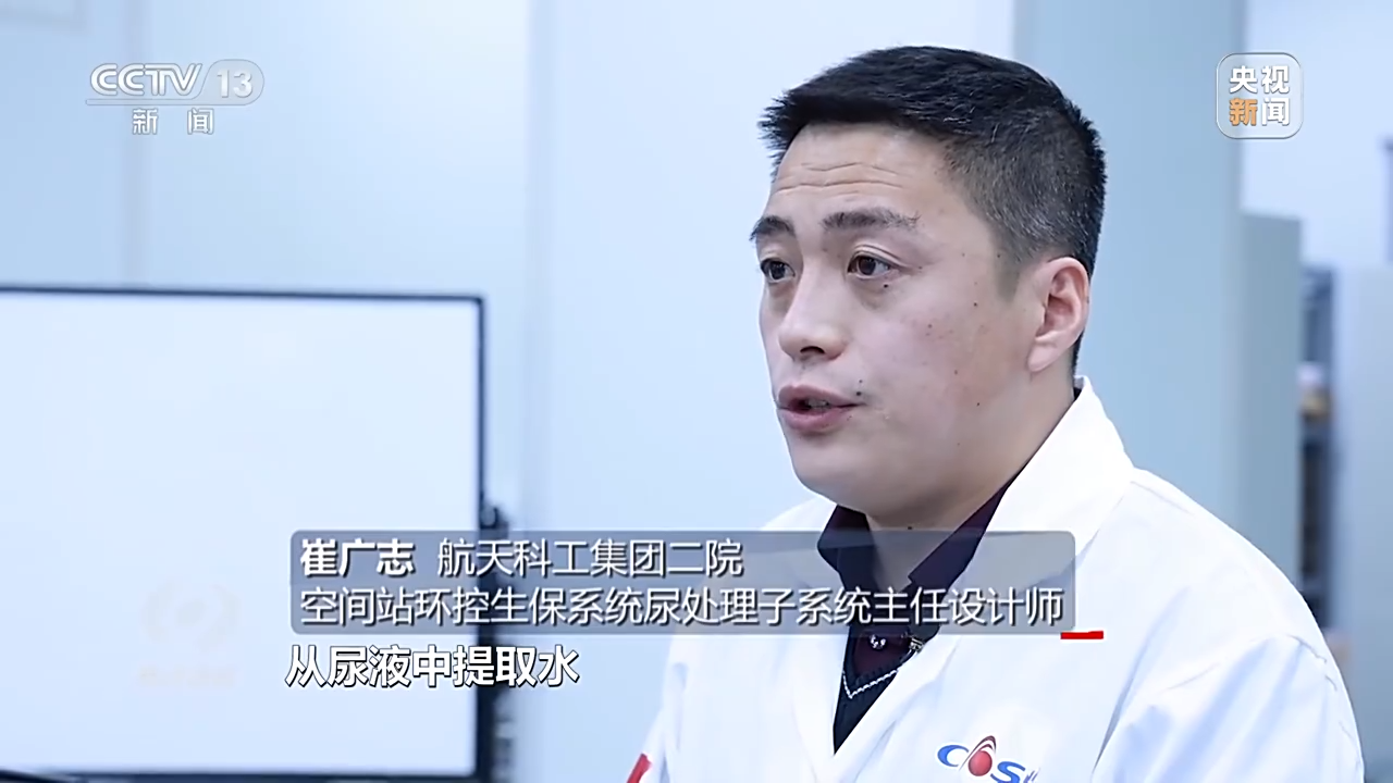 航天科工集团二院空间站环控生保系统尿处理子系统主任设计师 崔广志:从尿液中提取水,而且还是在空间环境下应用,难度非常大。首先,尿液的成分比较复杂,其次,在空间微重力的环境下,在提取水的过程中会有大量的气体产生,管理非常难。