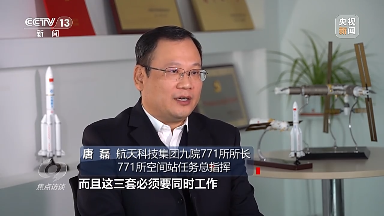 航天科技集团九院771所所长、771所空间站任务总指挥 唐磊:对于一个卫星来说,需要主备两套,可是到了我们空间站需要三套,而且三套必须要同时工作,为了防止任何一个地方出现故障,在轨寿命要求至少十年以上。
