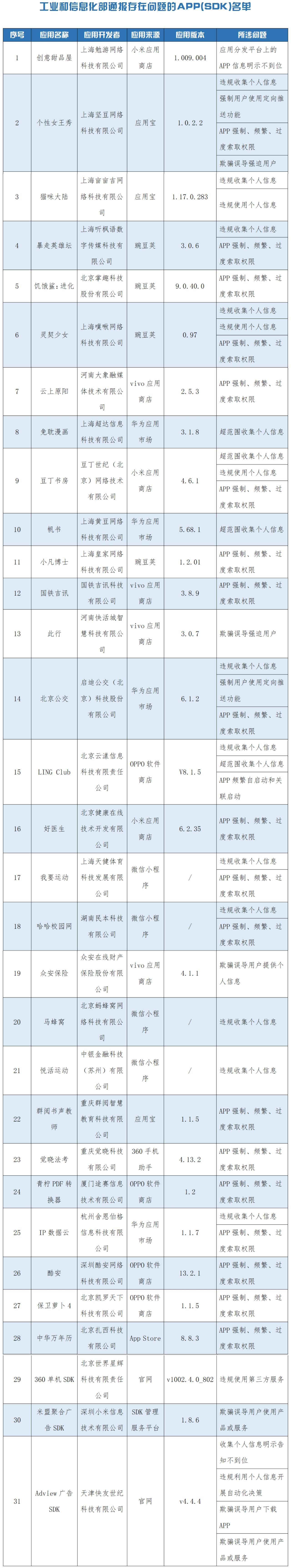 7月7日,工业和信息化部通报了31款存在侵害用户权益行为的App(SDK),内容如下:
