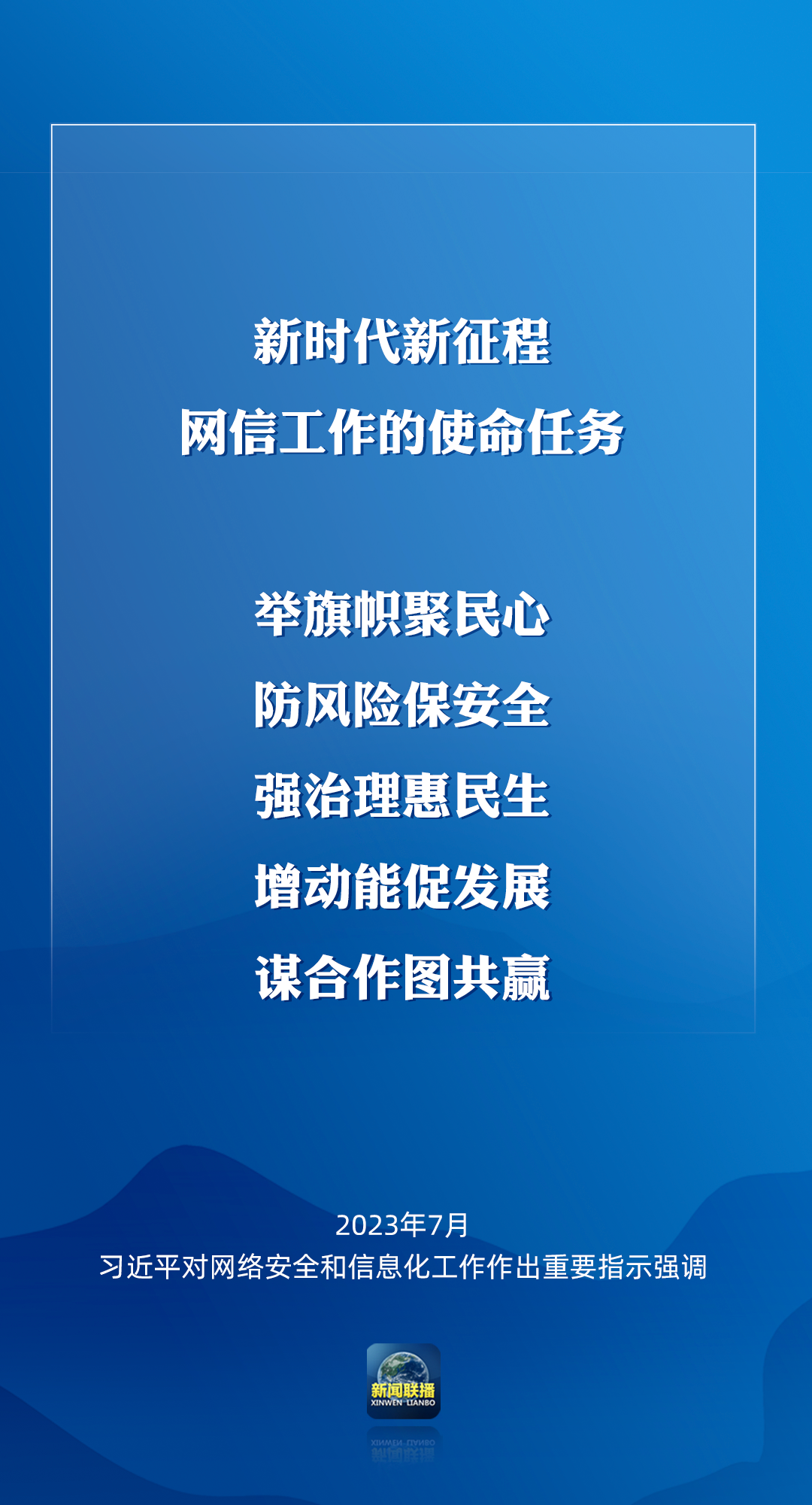 新时代新征程,网信工作的使命任务是什么呢?具体有五个方面:举旗帜聚民心、防风险保安全、强治理惠民生、增动能促发展、谋合作图共赢。