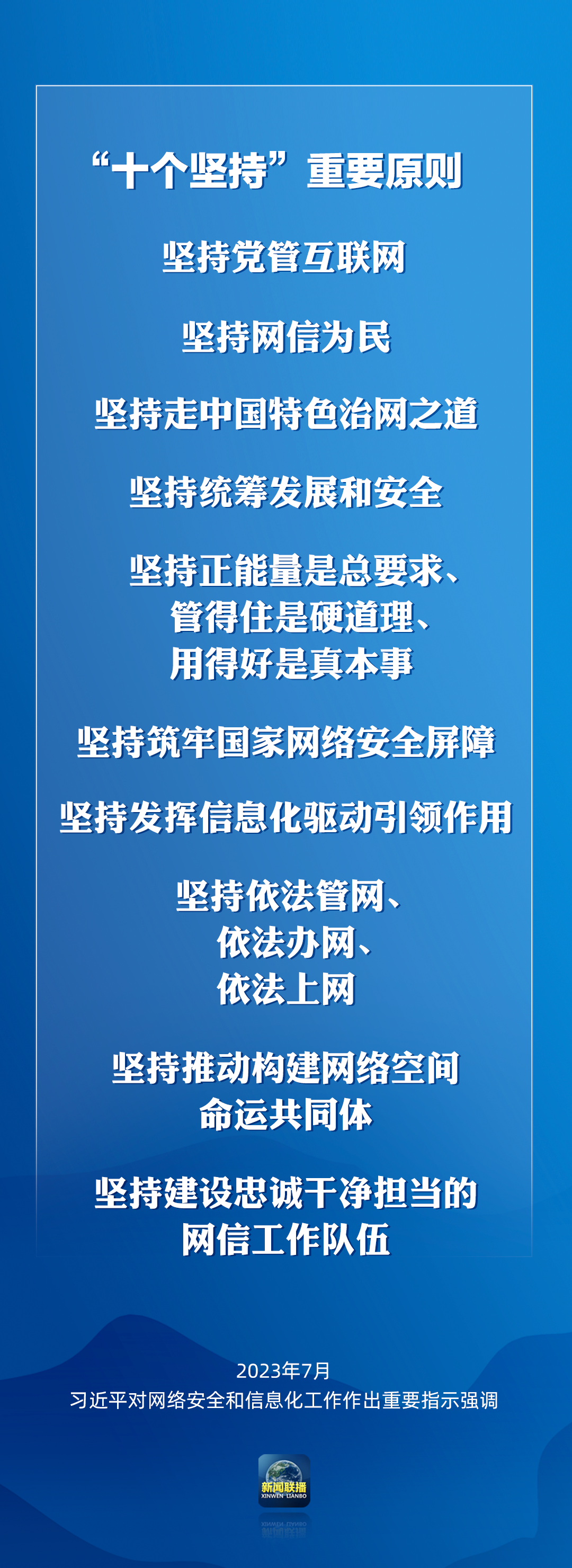 而“十个坚持”重要原则具体包括:坚持党管互联网,坚持网信为民,坚持走中国特色治网之道,坚持统筹发展和安全,坚持正能量是总要求、管得住是硬道理、用得好是真本事,坚持筑牢国家网络安全屏障,坚持发挥信息化驱动引领作用,坚持依法管网、依法办网、依法上网,坚持推动构建网络空间命运共同体,坚持建设忠诚干净担当的网信工作队伍。非常明晰明确,可以一一对照落实。