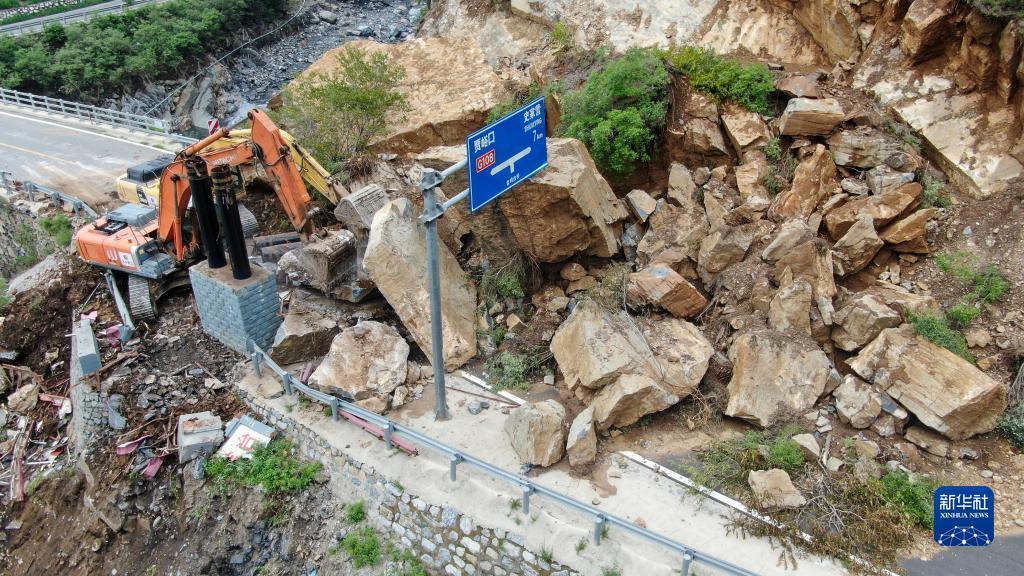 8月6日,在北京市房山区史家营乡金鸡台村附近,北京建工机施集团的大型机械设备在清理阻断道路的落石(无人机照片)。