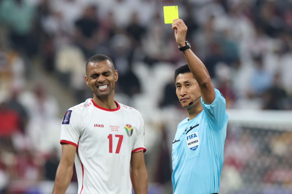 2月10日,主裁判马宁(右)向约旦队球员萨利姆·阿亚林出示黄牌。新华社记者 丁汀 摄