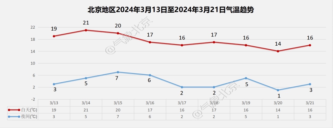 北京市气象台12日17时发布:今天夜间晴间多云,南风3级转北风1~2级,最低气温2℃;明天白天晴,北转南风2~3级,最高气温19℃。明天白天天晴气爽,气温明显回升,适宜交通出行和户外活动;昼夜温差大,早晚出行注意添衣保暖,谨防感冒;天干物燥,注意用火用电安全。
