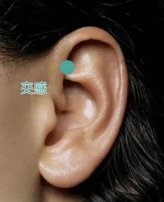 交感:此穴位于对耳轮下角末端与耳轮内缘相交处。