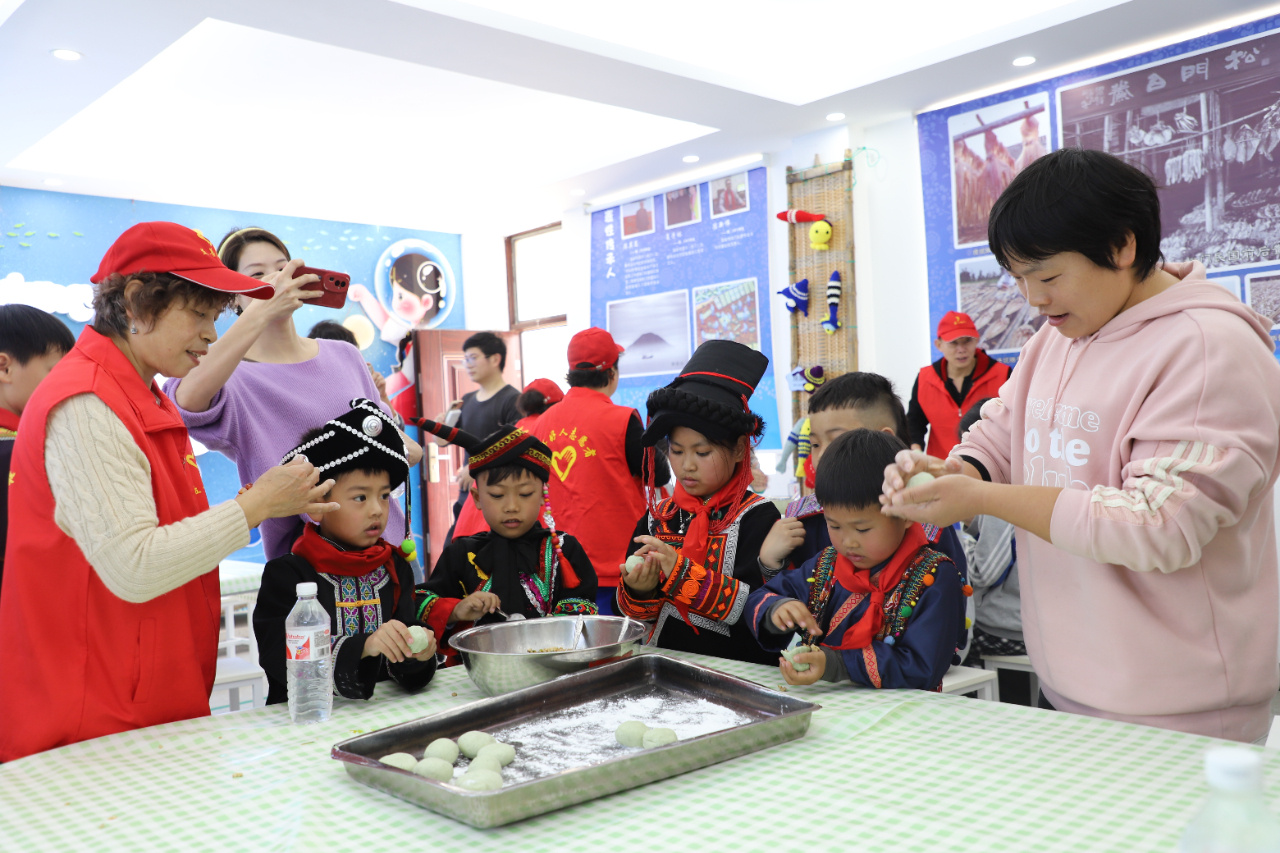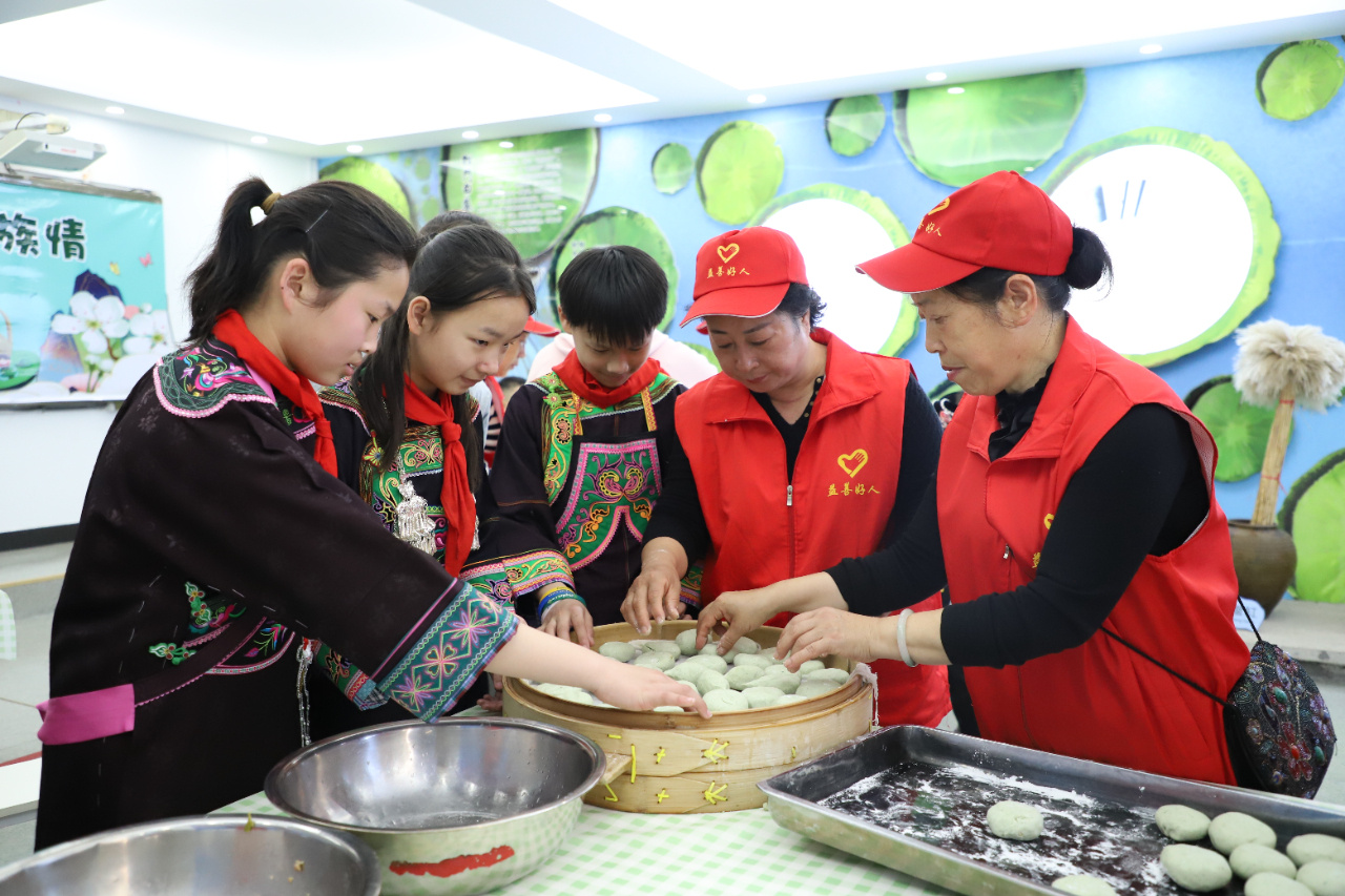 当天上午,学生与志愿者又来到松门镇第二小学,在学校的劳动教室开展“童心做青团,温暖民族情”活动。各族学生在老师和志愿者的帮助下,一起揉面团、馅佐料,每个步骤都有条不紊。不一会儿,一个个圆滚滚的、散发着“春天”香气的青团就做出来了,志愿者们赶忙把青团放到了蒸炉里蒸。10分钟不到,新鲜的青团出炉了,孩子们看着冒着热气的青团,又尝了尝春天的味道,脸上洋溢起了幸福的笑容。